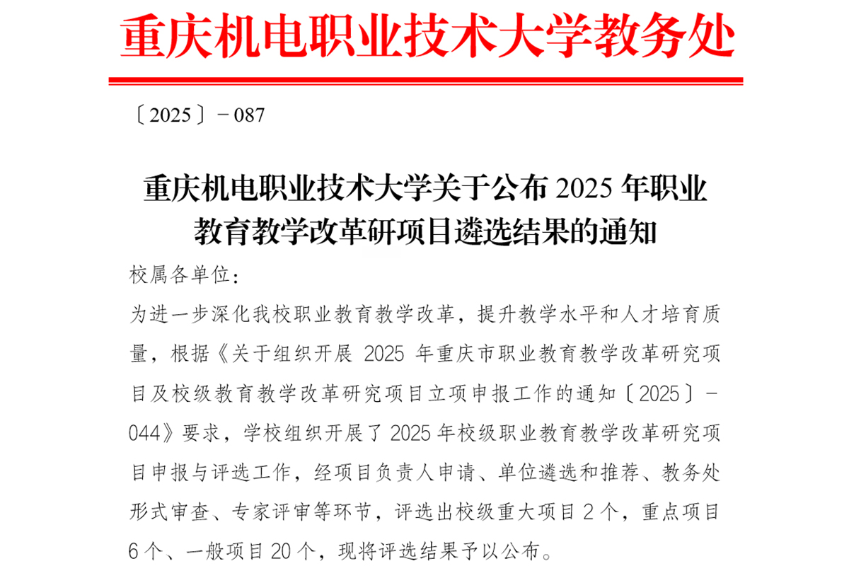 近日,重庆市教育委员会发布了《关于公布2025年职业教育教学改革研究项目遴选结果的通知》(渝教职成函〔2025〕48号),beat365官网成功立项11项重庆市职业教育教学改革研究项目,其中重大项目1项、重点项目1项,一般项目9项。
