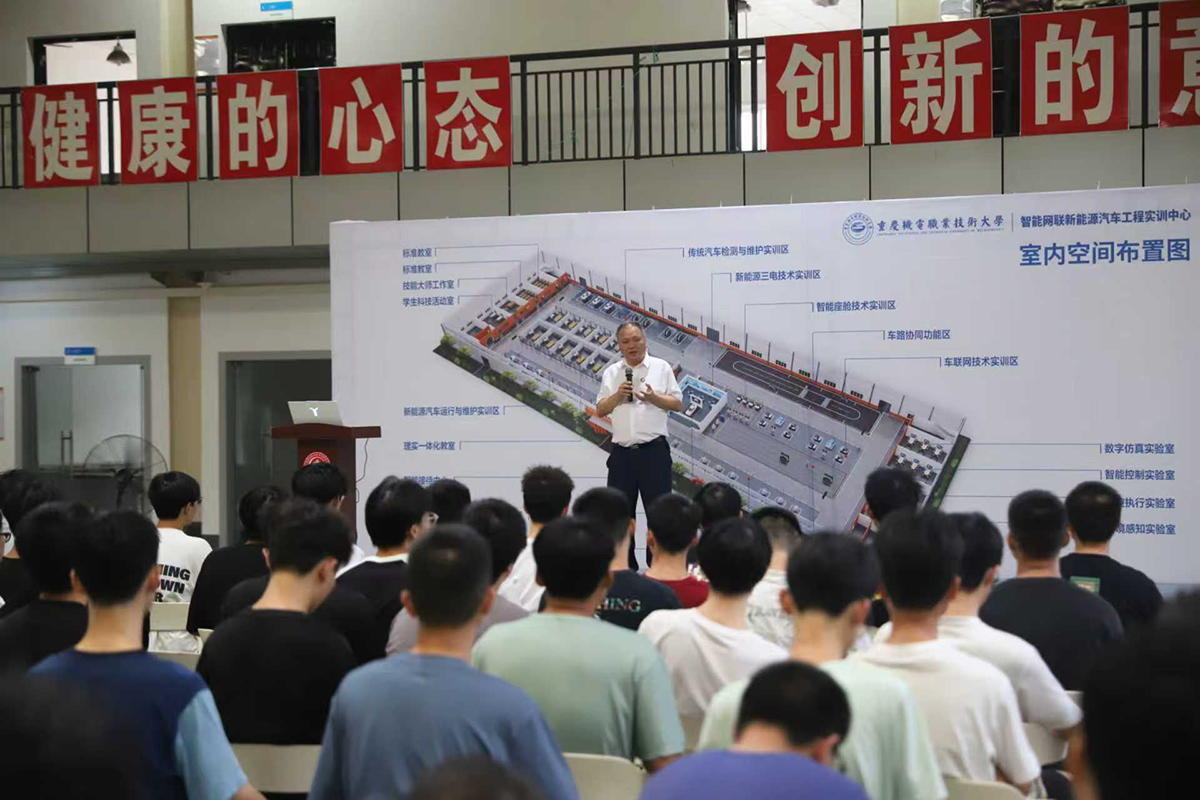 在第41个教师节来临之际,9月9日下午,校长石晓辉教授走进车辆与交通学院实训教学中心,为2025级汽车工程技术专业的392名新生讲授了生动的“专业教育第一课”。