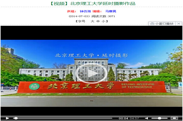 不知从何时开始,一个叫做《BIT Timelapse 2014》的延时摄影作品开始在北理人的朋友圈、社交圈里如“病毒”一般扩散、传播。不到五分钟的短短视频,给人以强烈的视觉冲击:人行穿梭、昼夜交替、季节更迭、云朵诡谲,这不仅是一种美,更是一种从视觉表象到心里深层的震荡,我们无法想象每天学习、生活、工作的校园竟然是如此之美,单调平凡的四季、白云变换竟能如此动感的表现。